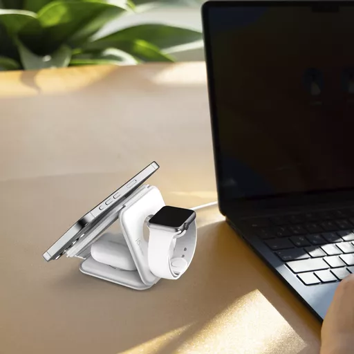 Introducing the game-changer in wireless charging technology – Qi2! With this advance technology applied on our product – the Qi2 3-in-1 Magnetic Travel Wireless Charging Station, no more dilemmas from choosing between optimize charging for iPhone® or Android™ phone. Our revolutionary magnetic induction technology delivers blazing-fast 15W wireless charging, compatible with iPhone® 12 series or later and Android™ phones. Transform the charging setup effortlessly for a fresh look wherever with Qi2 3-in-1 Magnetic Travel Wireless Charging Station. Place it flat with your charging devices neatly place side by side on top, or fold it into a triangular stand, have your phone attach against the magnetic charging pad, sit back and relax on some videos while charging. It’s foldable; therefore, you may fold it and slip it into your baggage, ready to go! Just reimagine the next level of personalized comfort when watching a video or having a video conference, hands free anywhere you are! A total output of maximum 22.5W is perfect for charging 3 devices at the same time. 15W for magnetic wireless charging, 2.5W for Apple® Watch®, and 5W for earbuds or maybe another phone while open it wide. The safety of user is our top priority; the product comes with overheating, overcurrent, under voltage and FOD protection.